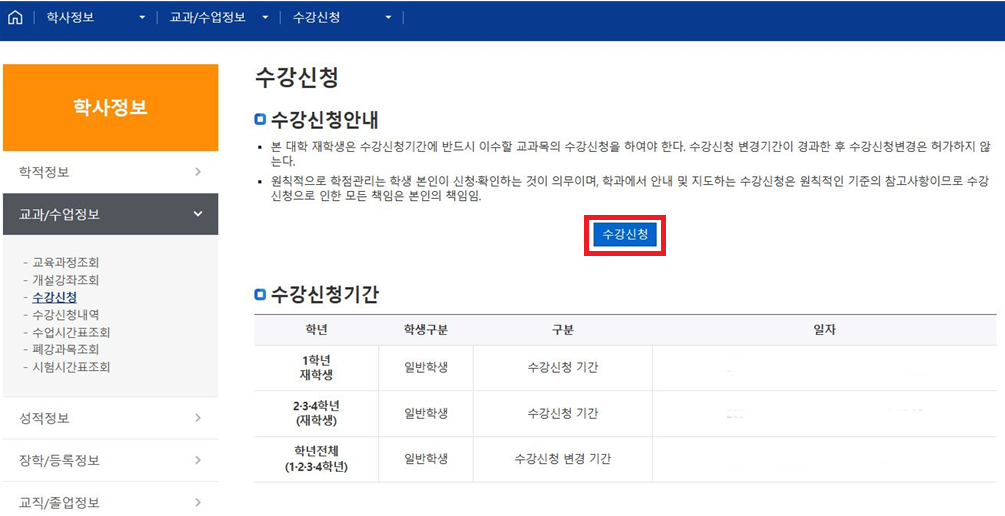학사정보→수강신청