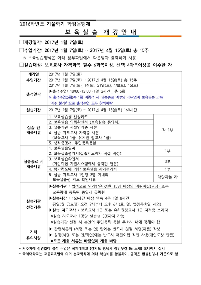 2016 학년도 겨울학기 보육실습 과정 신청이 마감되었습니다