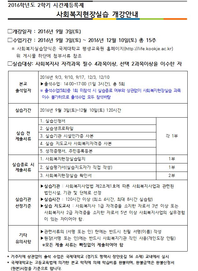 2016학년도 2학기 사회복지실습 개강안내 (마감)