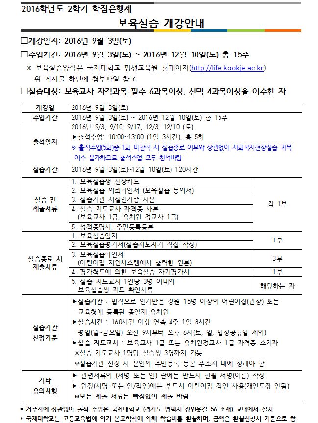 2016학년도 2학기 보육실습 개강안내 (마감)